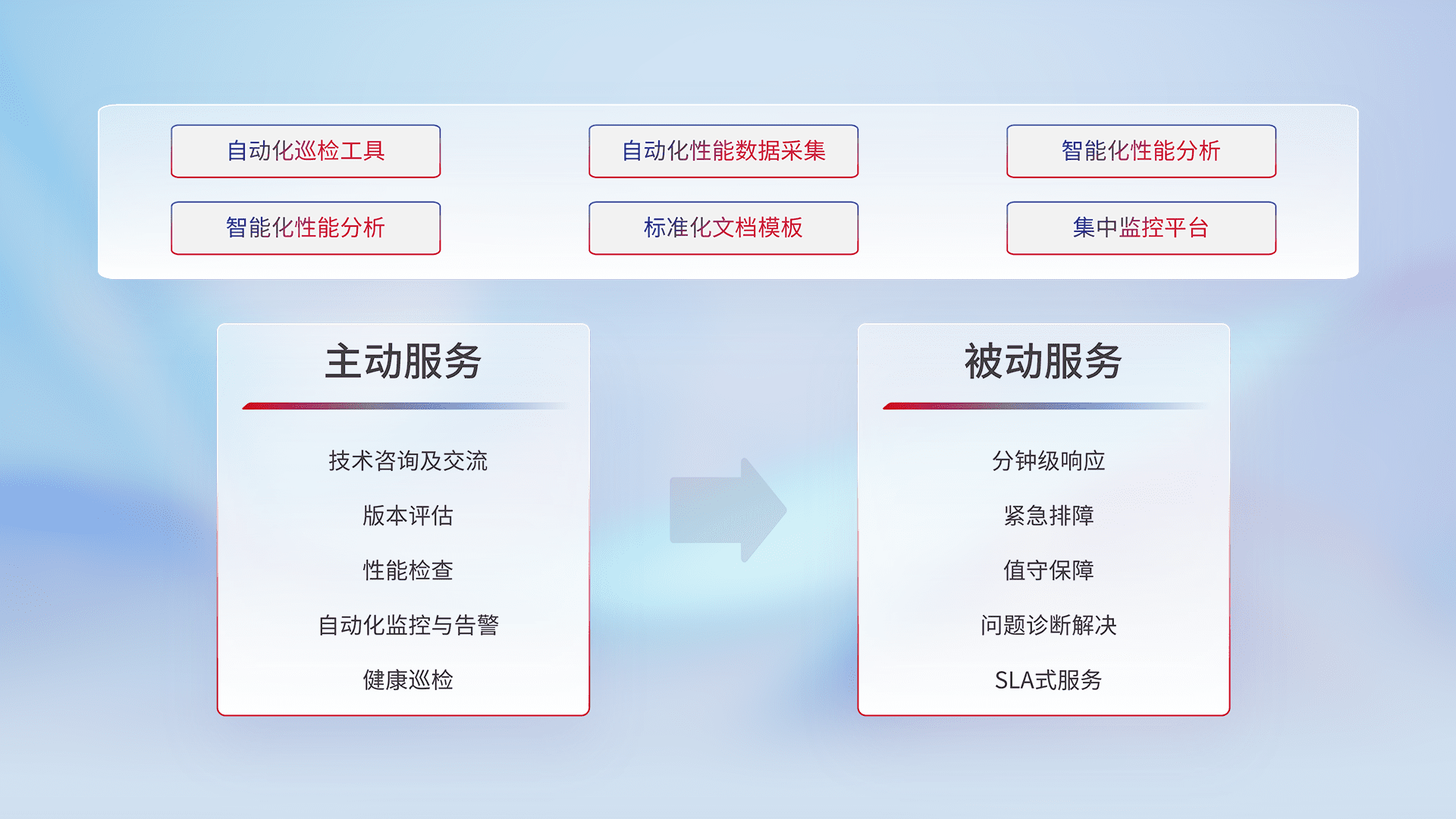 智能化工具和标准化文档,,保障服务质量,,,,提供主动服务(包含技术咨询、、版本评估、、性能检查、、自动化监控与告警、、、健康巡检)和被动服务包含(分钟级响应、、紧急排障、、值守保障、、、、问题诊断解决、、、、SLA服务)。。